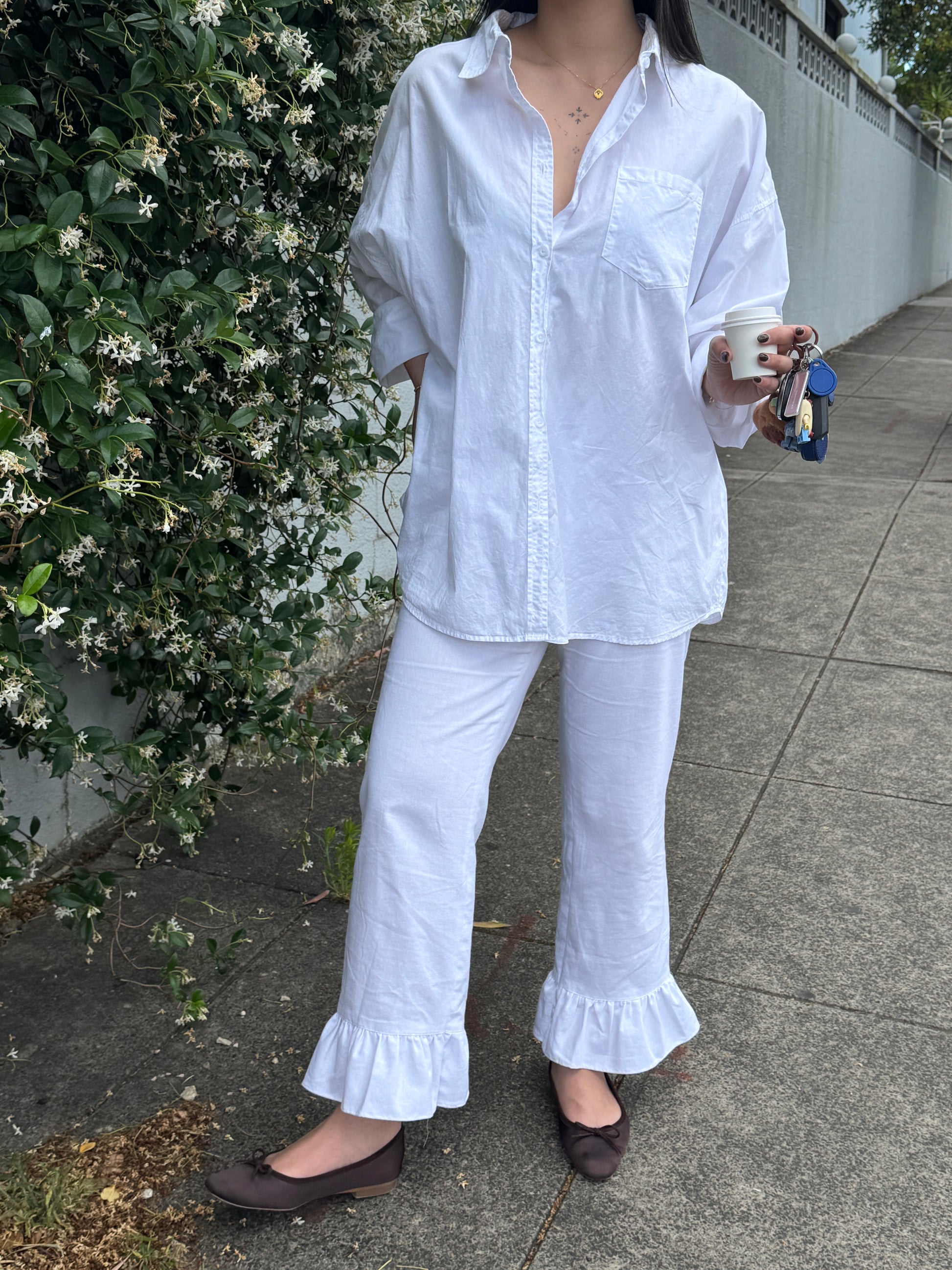Discover your new favourite warm-weather staple. The Jasmine Pants are cut for an easy, straight-leg shape and built on a comfortable mid-waist design. The cotton-linen blend offers the perfect balance of structure and airy comfort. The defining touch is the playful ruffle hem, which adds a charming, whimsical movement to every step. Perfect for transitioning from office hours to evening strolls.